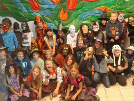 Ve vyučování jsme si vyprávěli o anglických tradicích a českých podzimních svátcích – Dušičky. Zapálili jsme svíčku na vzpomínku těch, kteří již nemohou být mezi námi. Vypracovávali jsme nejrůznější úkoly s halloweenskou tématikou, děti se naučily anglickou píseň, kterou doprovodily svými tanečními kreacemi. Pohybovaly se jako zombie, kostlivci, duchové a další monstra.
