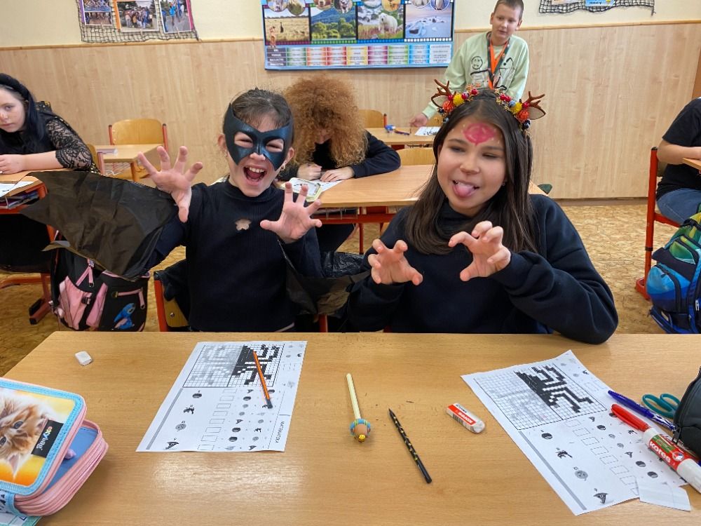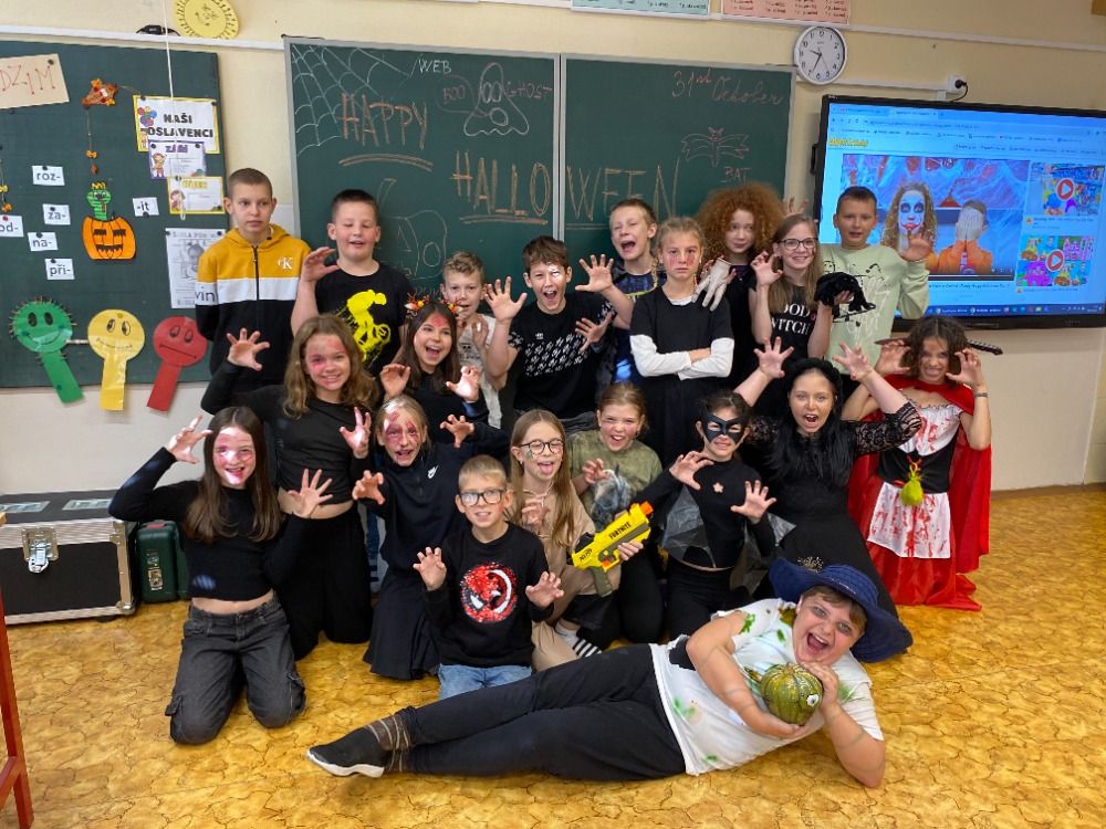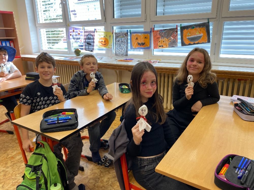 Stejně jako v předchozích letech jsme ve škole uchopili hravou a radostnou stránku tohoto svátku. A tak v pátek 31.10. usedli do lavic v naší třídě 5. B i duchové, čarodějnice a čarodějové a další příšerky a strašidla. I připravené pomůcky, hry a pracovní listy byly plné pavouků, pavučin, duchů a strašidel.