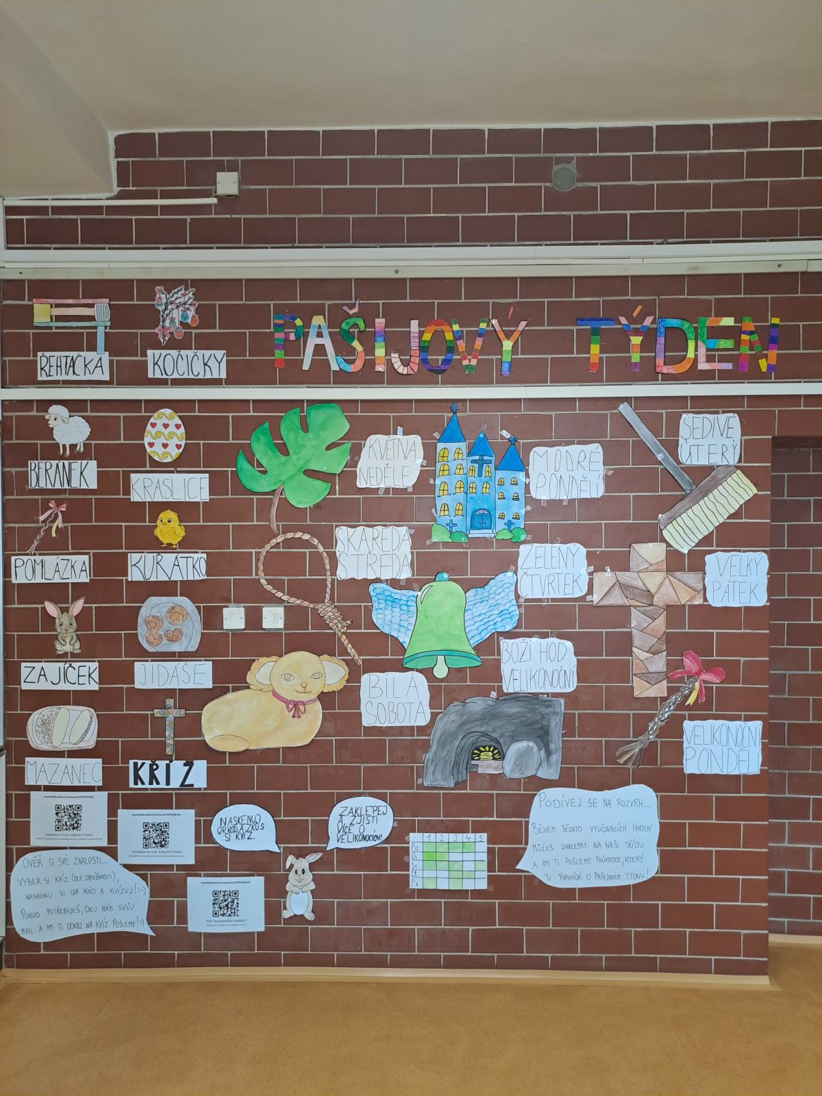Některé třídy využily i informační stěnu o Pašijovém týdnu, kterou pro všechny žáky školy třída 5. A připravila. K dispozici byla i lektorka Justýna Loukotová, žákyně třídy 5. A, která byla připravena a zájemce s Pašijovým týdnem seznámila blíže. V rámci hodin informatiky pak třída 5. A vytvořila i online kvízy na ověření znalostí o Pašijovém týdnu.